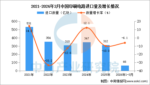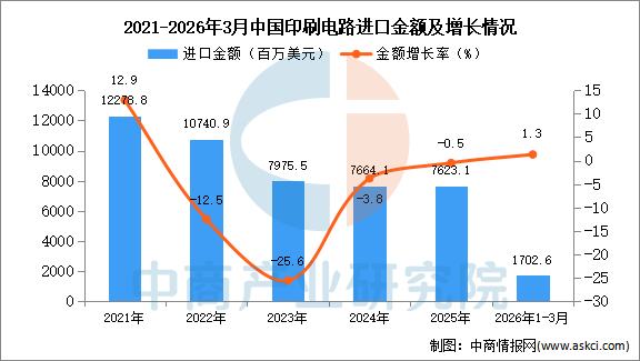 2026年3月中国印刷电路进口量及金额增长情况