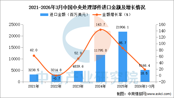 从金额方面来看,数据显示,2026年1-3月中国中央处理部件进口金额5166.4百万美元,同比增长18.5%。