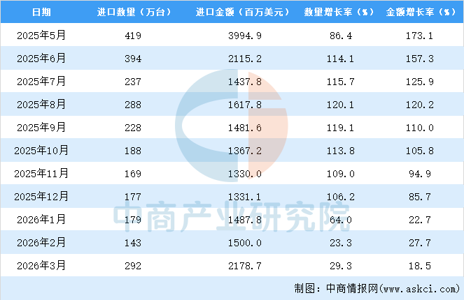 2026年3月中国中央处理部件进口量及金额增长情况