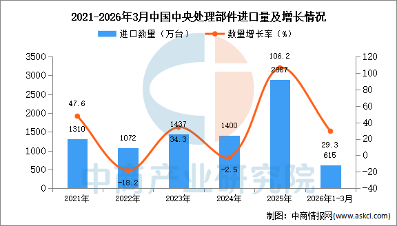 中商情报网讯:据中商产业研究院数据库显示,2025年中国中央处理部件进口量2887万台,同比增长106.2%。最新数据显示,2026年1-3月中国中央处理部件进口量615万台,同比增长29.3%。