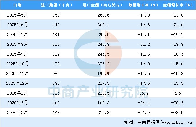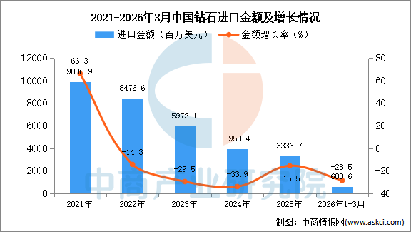 从金额方面来看,数据显示,2026年1-3月中国钻石进口金额600.6百万美元,同比下降28.5%。
