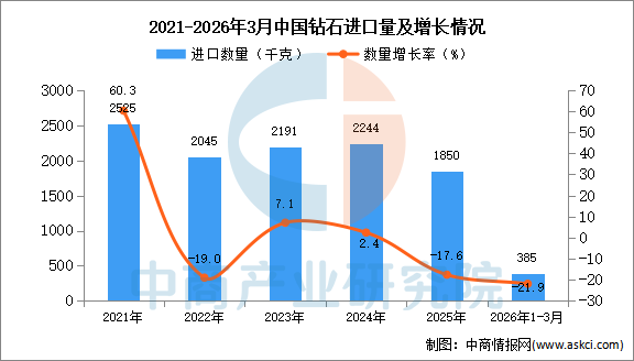 中商情报网讯:据中商产业研究院数据库显示,2025年中国钻石进口量1850万吨,同比下降17.6%。最新数据显示,2026年1-3月中国钻石进口量385万吨,同比下降21.9%。