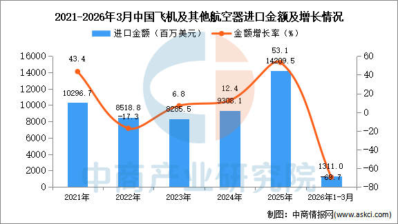 2026年3月中国飞机及其他航空器进口量及金额增长情况