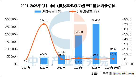 中商情报网讯:据中商产业研究院数据库显示,2025年中国飞机及其他航空器进口量269237架,同比增长39.8%。最新数据显示,2026年1-3月中国飞机及其他航空器进口量81621架,同比增长86.9%。