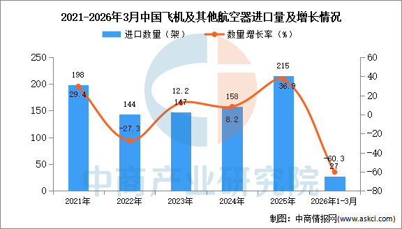 2026年3月中国空载重量超过2吨的飞机进口量及金额增长情况