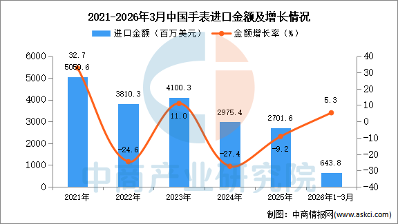 从金额方面来看,数据显示,2026年1-3月中国手表进口金额643.8百万美元,同比增长5.3%。