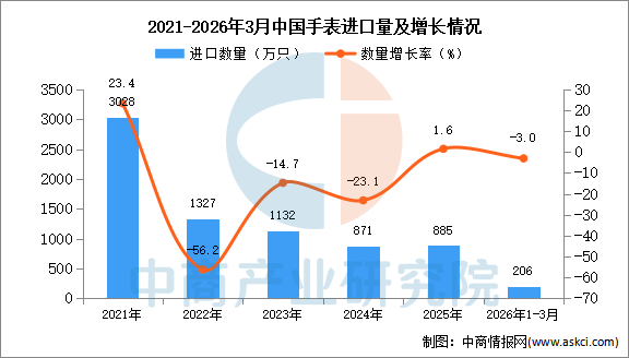 中商情报网讯:据中商产业研究院数据库显示,2025年中国手表进口量885万只,同比增长1.6%。最新数据显示,2026年1-3月中国手表进口量206万只,同比下降3%。