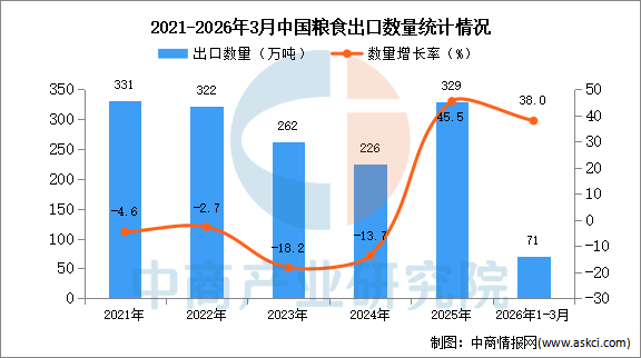 中商情报网讯:据中商产业研究院数据库显示,2025年我国粮食的出口量329万吨,同比增长45.5%。最新数据显示,2026年1-3月中国粮食出口量71万吨,同比增长38%。