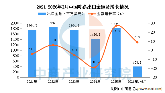 从金额方面来看,数据显示,2026年1-3月中国粮食出口金额4035百万美元,同比增长8.8%。