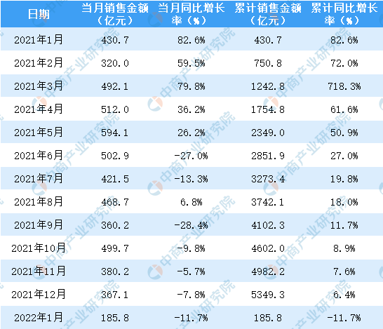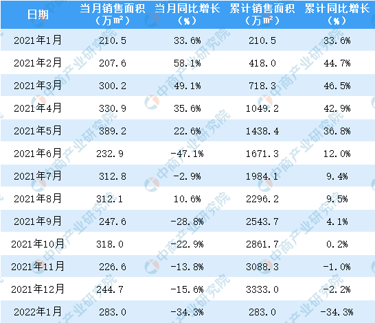 2021-2022年1月保利地产销售面积及金额情况统计