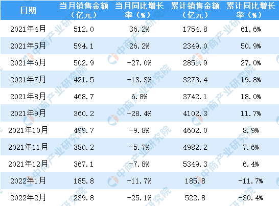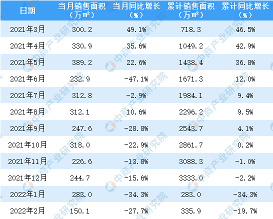 2021-2022年2月保利地产销售面积及金额情况统计
