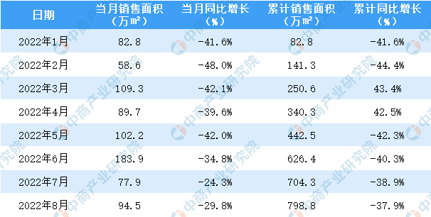 2022年1-8月中海地产销售面积及金额情况统计