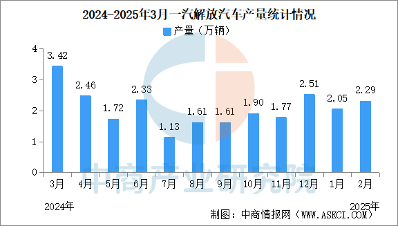 中商情报网讯:2月,一汽解放汽车产量2.29万辆,同比增长52.81%。1-2月,一汽解放汽车累计产量4.34万辆,同比减少1.20%。
