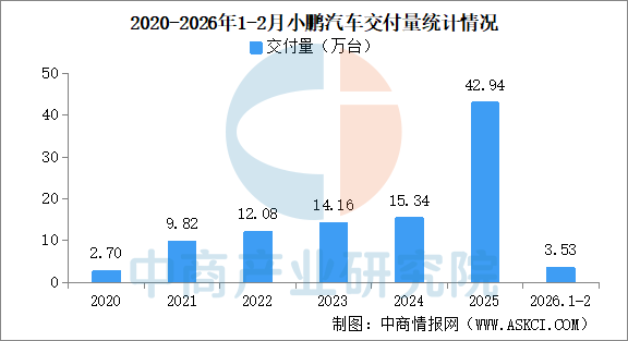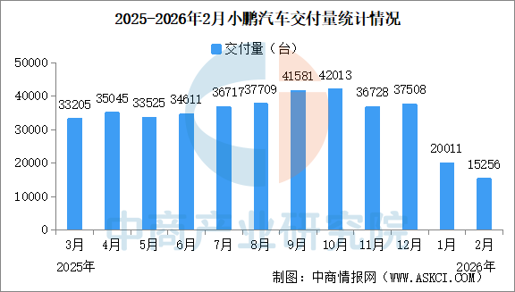 中商情报网讯:2026年2月,小鹏汽车共交付新车15256台,环比减少23.8%,同比减少49.9%。2026年1-2月交付新车3.53万台。