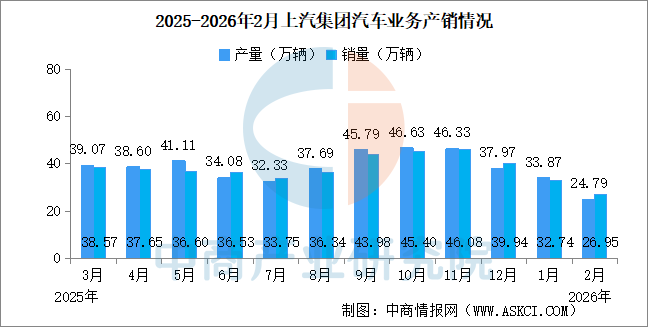 中商情报网讯:2月,上汽集团产量24.79万辆,同比减少5.77%。销量26.95万辆,同比减少8.64%。1-2月,上汽集团汽车累计产量58.66万辆,同比减少0.36%。累计销量59.69万辆,同比增长6.76%。