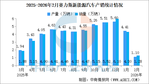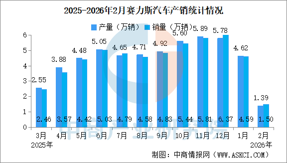 中商情报网讯:2026年2月,赛力斯汽车产量1.39万辆,同比减少32.26%。销量1.50万辆,同比减少29.61%。2026年1-2月,赛力斯汽车产量6.01万辆,同比增长39.47%。累计销量6.10万辆,同比增长39.31%。