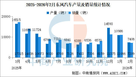 中商情报网讯:2026年2月,东风汽车产量7406辆,同比减少8.28%。销量7209辆,同比减少28.10%。2026年2月,东风汽车累计产量1.84万辆,同比增长11.06%。累计销量1.83万辆,同比减少0.87%。
