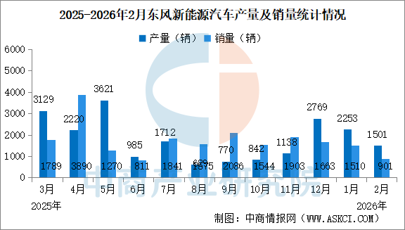 2026年2月,东风新能源汽车产量1501辆,同比增长78.27%。销量901辆,同比减少13.94%。2026年2月,东风新能源汽车累计产量3754辆,同比增长177.05%。累计销量2411辆,同比增长57.89%。
