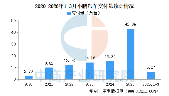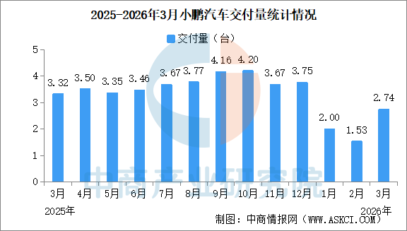 中商情报网讯:近日,小鹏汽车公布最新交付成绩:2026年3月,小鹏汽车共交付新车2.74万台,环比增长80%,同比减少17.4%。小鹏X9交付3075台,同比劲增134%,全球累计交付突破5.50万台。2026年1-3月,小鹏汽车共交付新车6.27万台,环比增长80%,同比减少33.3%。