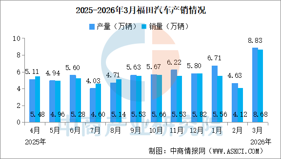 中商情报网讯:2026年3月,福田汽车产量8.83万辆,同比增长14.63%。销量8.68万辆,同比增长19.02%。累计产量20.18万辆,同比增长10.14%。2026年1-3月,福田汽车累计销量18.35万辆,同比增长7.82%。