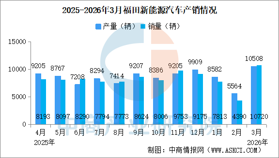 2026年3月,福田新能源汽车产量1.05万辆,同比减少14.67%。销量1.07万辆,同比减少1.44%。累计产量2.47万辆,同比减少9.32%。2026年1-3月,福田新能源汽车累计销量2.29万辆,同比减少10.32%。