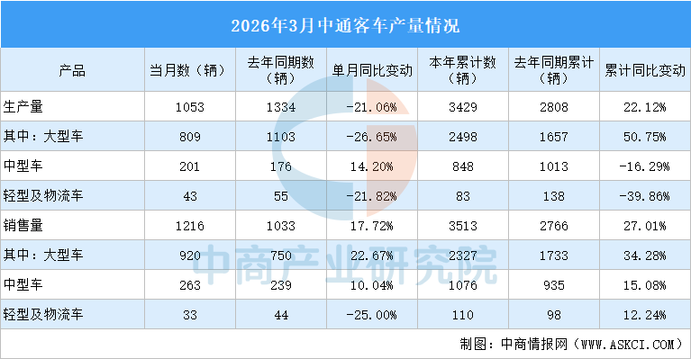 中商情报网讯:3月中通客车产量1053辆,同比减少21.06%。1-3月中通客车累计产量3429辆,同比增长22.12%。