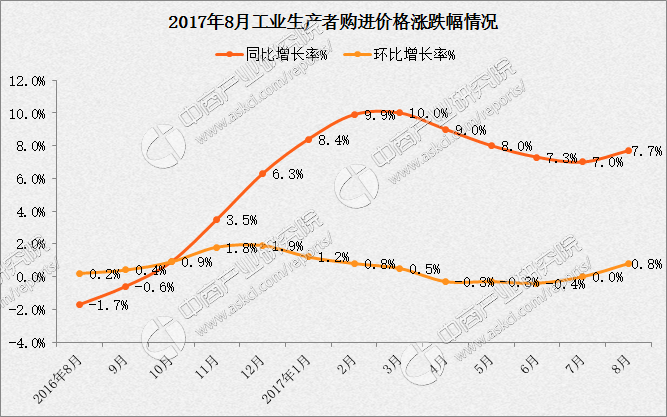 中商情报网讯 2017年8月份,全国工业生产者出厂价格同比上涨6.3%,环比上涨0.9%。工业生产者购进价格同比上涨7.7%,环比上涨0.8%。1-8月平均,工业生产者出厂价格同比上涨6.4%,工业生产者购进价格同比上涨8.4%。
