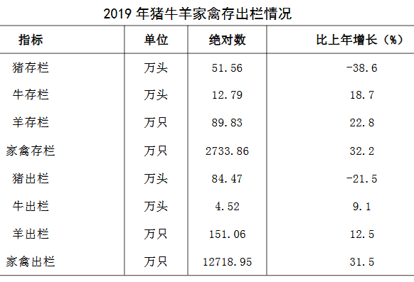 畜牧业平稳发展。肉蛋奶总产量69.64万吨,比上年增长7.4%。其中,肉类总产量26.13万吨,增长12.9%;奶类总产量40.14万吨,增长10.0%;禽蛋产量3.37万吨,下降35.2%。