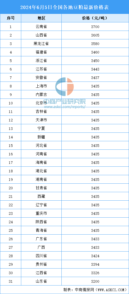 中商情报网讯:2024年6月5日全国豆粕价格有所下跌,从地区上看有涨有跌。6月5日全国豆粕均价为3435元/吨,环比每吨下跌8元。价格最高的是云南省,豆粕均价为3700元/吨。价格最低的是山东省,豆粕均价均为3200元/吨。以下是2024年6月5日全国各地豆粕最新价格表: