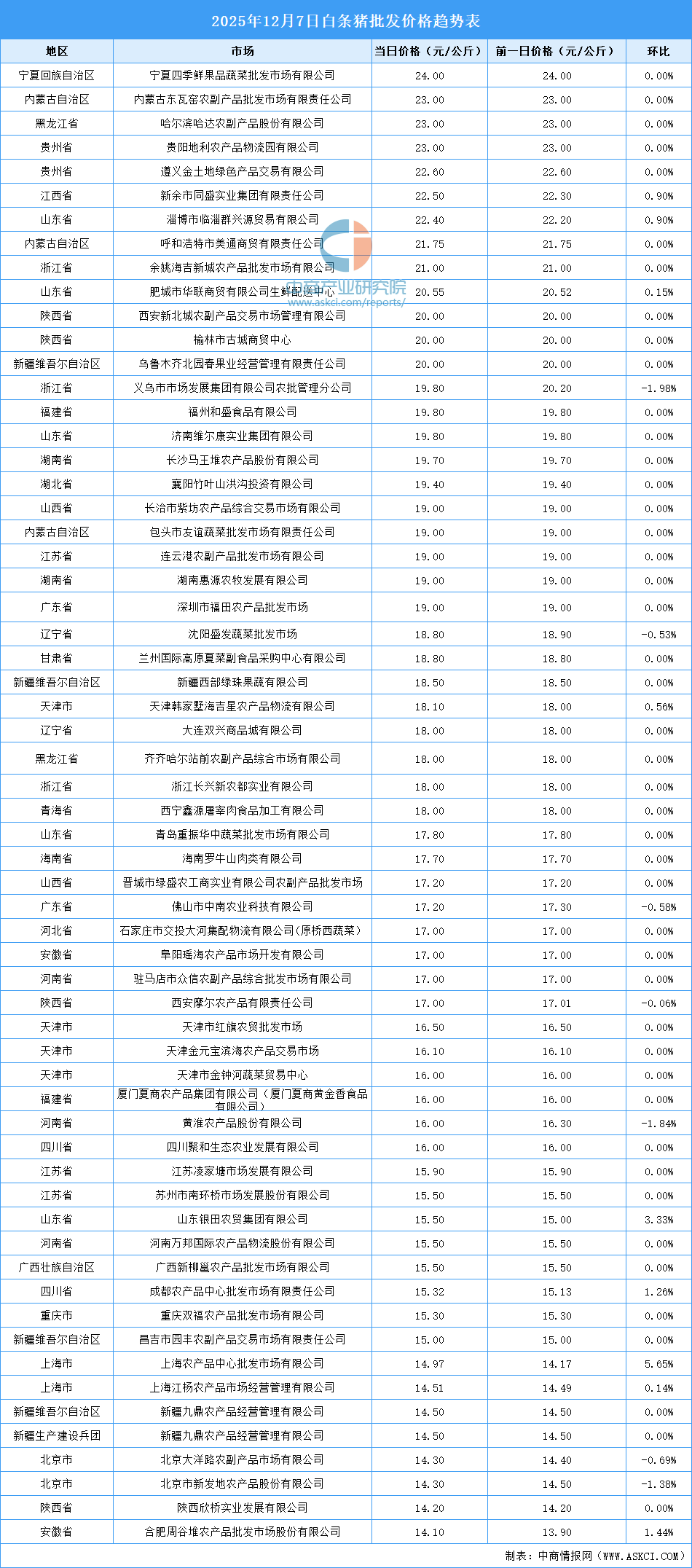 中商情报网讯:最新数据显示:12月7日全国白条猪平均价格为17.98元/公斤。其中,白条猪价格最高的市场是宁夏四季鲜果品蔬菜批发市场有限公司,当日价格为24.00元/公斤,环比持平。白条猪价格最低的是合肥周谷堆农产品批发市场股份有限公司,当日价格为14.10元/公斤,环比上涨1.44%。