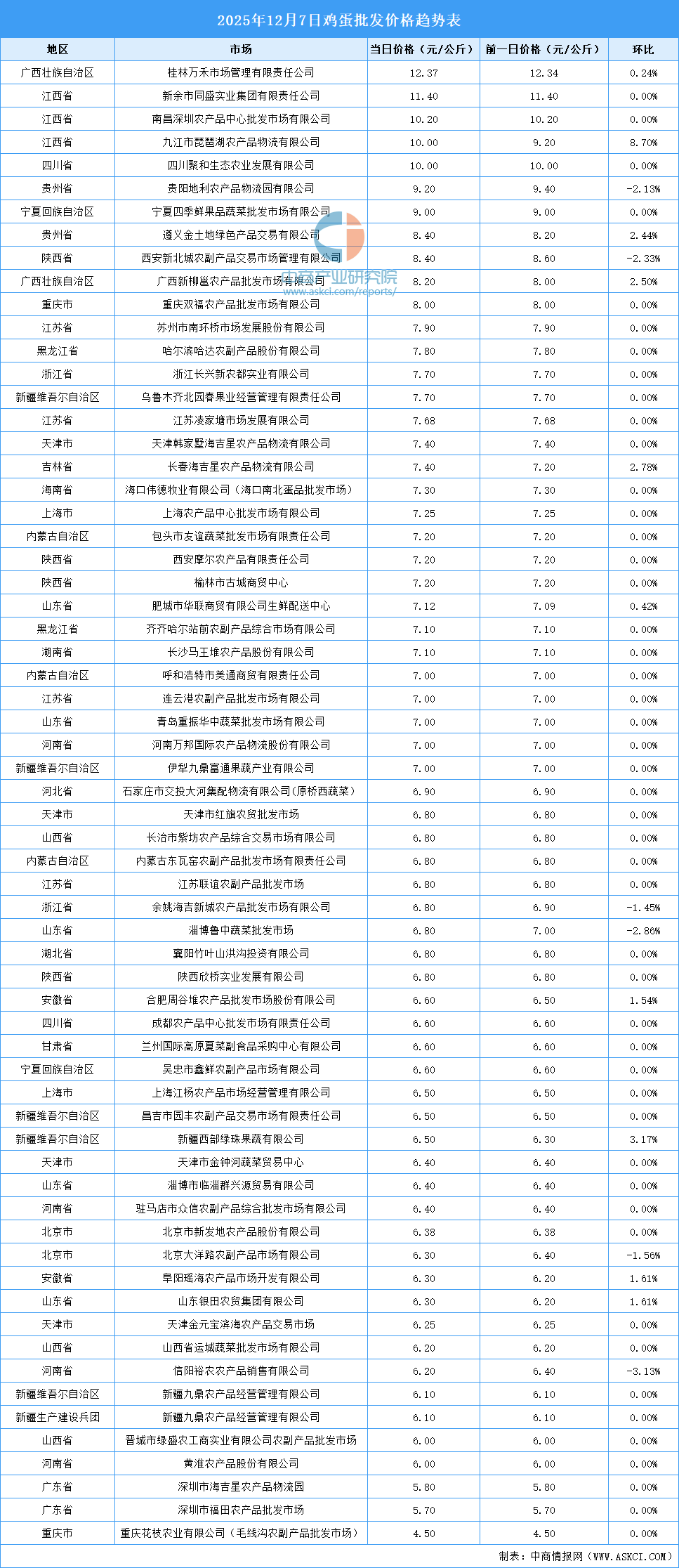 中商情报网讯:最新数据显示:12月7日全国鸡蛋平均价格为7.21元/公斤。其中,鸡蛋价格最高的市场是桂林万禾市场管理有限责任公司,当日价格为12.37元/公斤,环比上涨0.24%。鸡蛋价格最低的市场是重庆花枝农业有限公司(毛线沟农副产品批发市场),当日价格为4.50元/公斤,环比持平。
