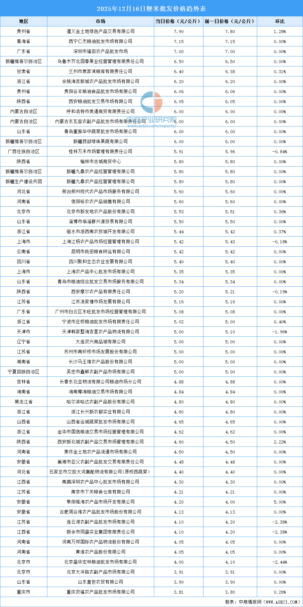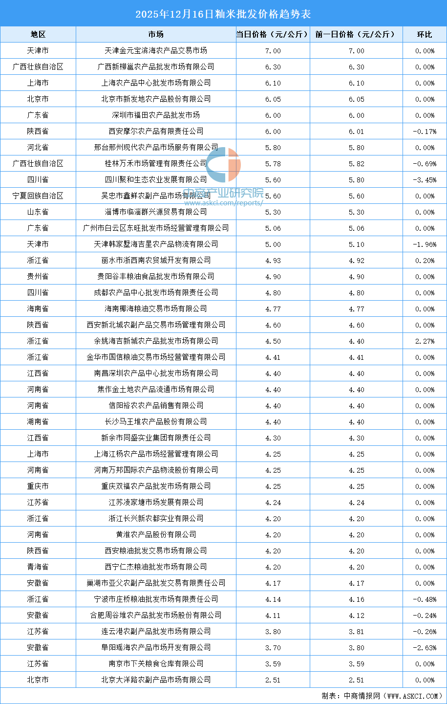 中商情报网讯:最新数据显示:12月16日,全国粳米当日均价为5.19元/公斤,籼米当日均价4.76元/公斤。其中,粳米价格最高的遵义金土地绿色产品交易有限公司,当日价格为7.90元/公斤,环比上涨1.28%。籼米价格最高的市场是天津金元宝滨海农产品交易市场,当日价格为7.00元/公斤,环比持平。以下是2025年12月16日全国大米价格趋势表详情: