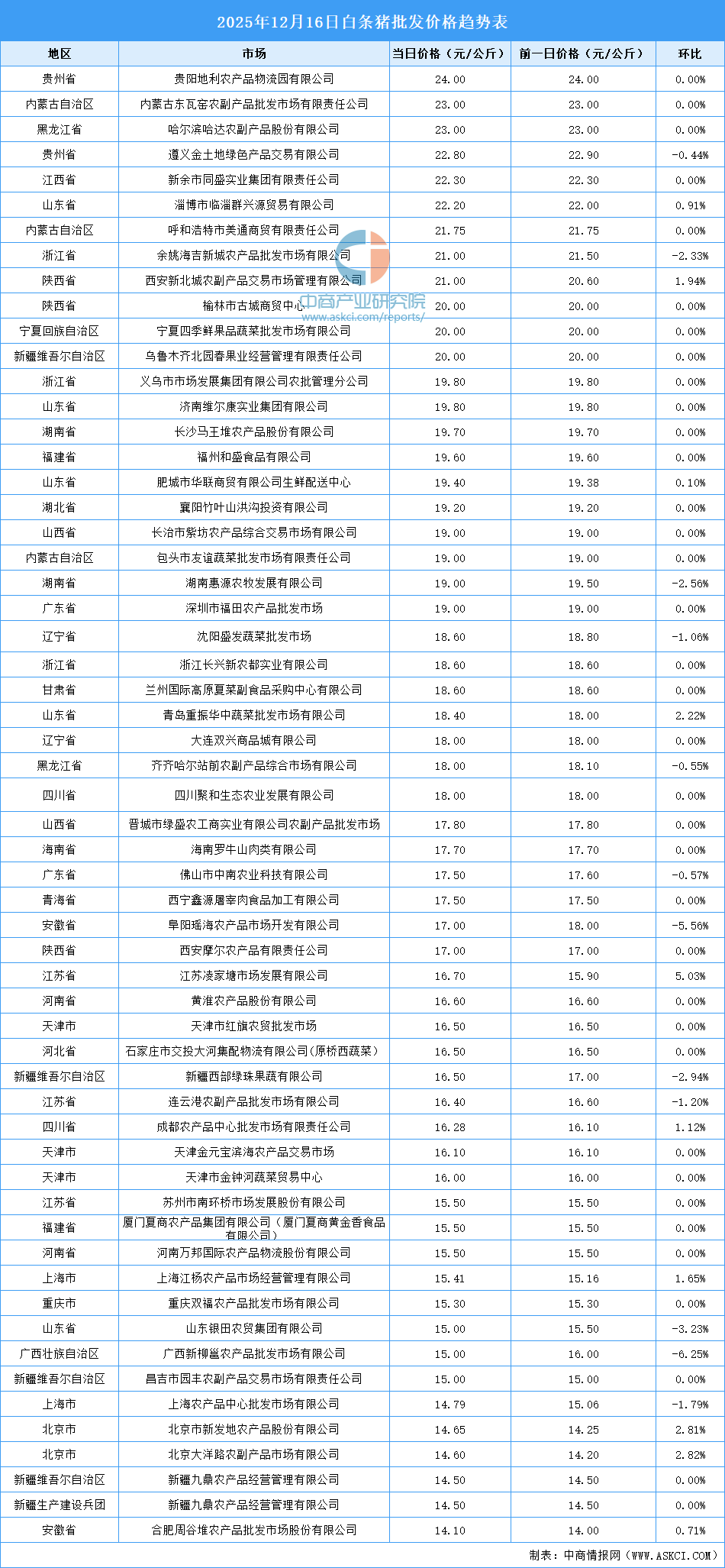 中商情报网讯:最新数据显示:12月16日全国白条猪平均价格为18.00元/公斤。其中,白条猪价格最高的市场是贵阳地利农产品物流园有限公司,当日价格为24.00元/公斤,环比持平。白条猪价格最低的是合肥周谷堆农产品批发市场股份有限公司,当日价格为14.10元/公斤,环比上涨0.71%。
