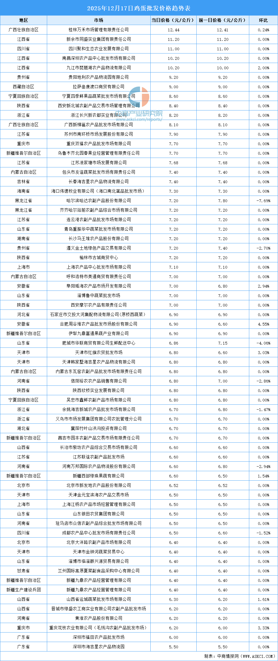 中商情报网讯:最新数据显示:12月17日全国鸡蛋平均价格为7.28元/公斤。其中,鸡蛋价格最高的市场是桂林万禾市场管理有限责任公司,当日价格为12.44元/公斤,环比上涨0.24%。鸡蛋价格最低的市场是深圳市海吉星农产品物流园,当日价格为5.50元/公斤,环比持平。