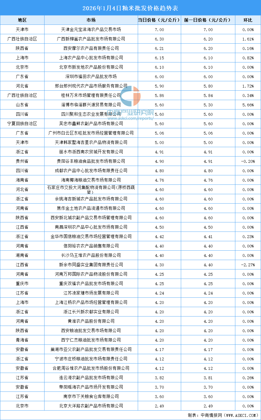 中商情报网讯:最新数据显示:1月4日,全国粳米当日均价为5.24元/公斤,籼米当日均价4.78元/公斤。其中,粳米价格最高的遵义金土地绿色产品交易有限公司,当日价格为7.90元/公斤,环比持平。籼米价格最高的市场是天津金元宝滨海农产品交易市场,当日价格为7.00元/公斤,环比持平。以下是2026年1月4日全国大米价格趋势表详情: