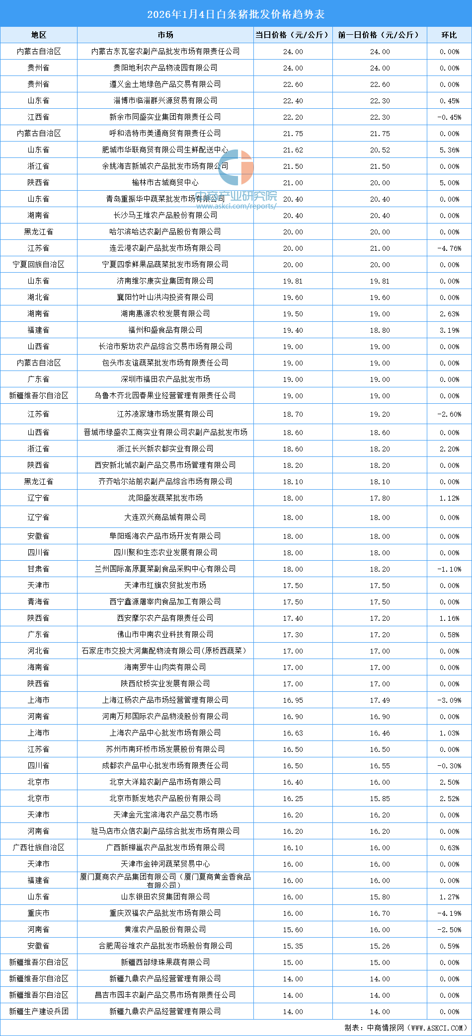 中商情报网讯:最新数据显示:1月4日全国白条猪平均价格为18.23元/公斤。其中,白条猪价格最高的市场是内蒙古东瓦窑农副产品批发市场有限责任公司和贵阳地利农产品物流园有限公司,当日价格均为24.00元/公斤。白条猪价格最低的是昌吉市园丰农副产品交易市场有限责任公司和新疆九鼎农产品经营管理有限公司,当日价格均为14.00元/公斤。