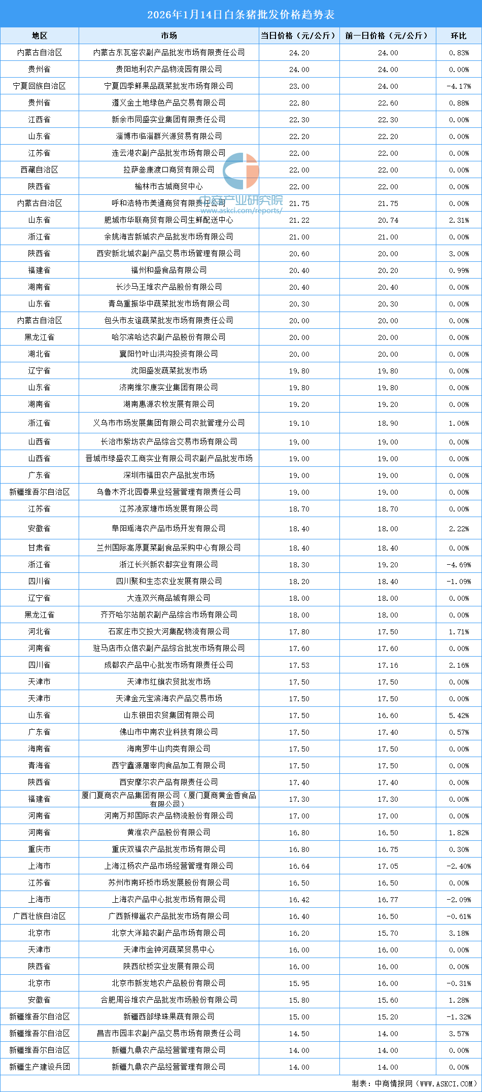 中商情报网讯:最新数据显示:1月14日全国白条猪平均价格为18.67元/公斤。其中,白条猪价格最高的市场是内蒙古东瓦窑农副产品批发市场有限责任公司,当日价格为24.20元/公斤,环比上涨0.83%。白条猪价格最低的是新疆九鼎农产品经营管理有限公司,当日价格为14.00元/公斤,环保持平。