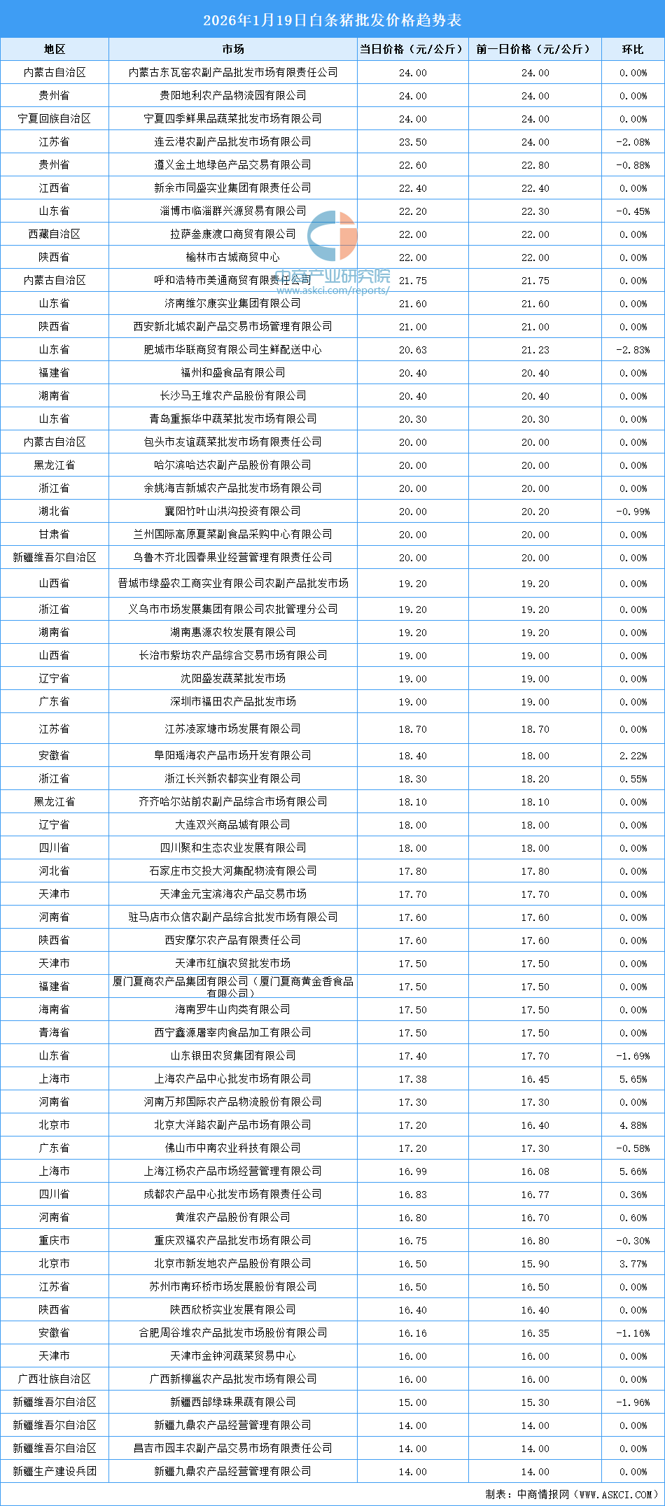 中商情报网讯:最新数据显示:1月19日全国白条猪平均价格为18.79元/公斤。其中,白条猪价格最高的市场是内蒙古东瓦窑农副产品批发市场有限责任公司、贵阳地利农产品物流园有限公司、宁夏四季鲜果品蔬菜批发市场有限公司,当日价格均为24.00元/公斤。白条猪价格最低的是昌吉市园丰农副产品交易市场有限责任公司和新疆九鼎农产品经营管理有限公司,当日价格均为14.00元/公斤。