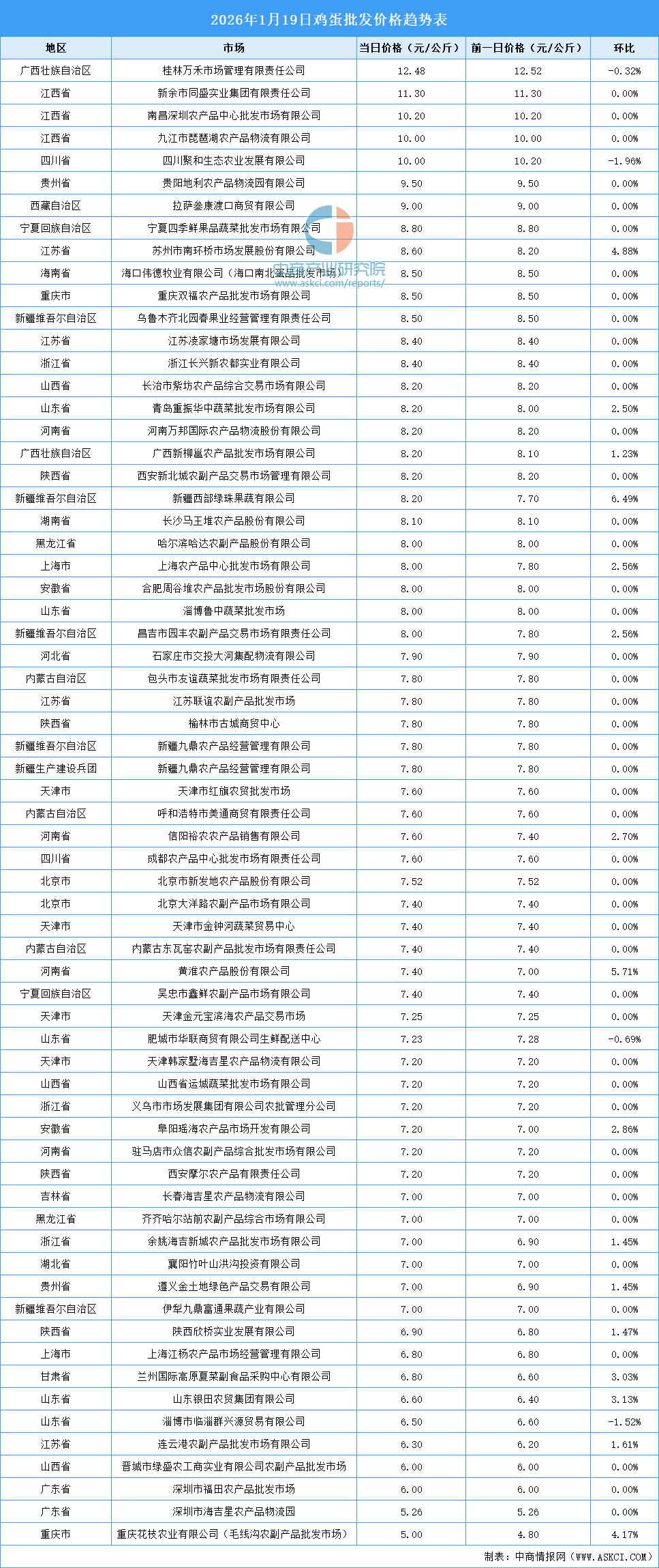 中商情报网讯:最新数据显示:1月19日全国鸡蛋平均价格为7.77元/公斤。其中,鸡蛋价格最高的市场是桂林万禾市场管理有限责任公司,当日价格为12.48元/公斤,环比下跌0.32%。鸡蛋价格最低的市场是重庆花枝农业有限公司(毛线沟农副产品批发市场),当日价格为5.00元/公斤,环比上涨4.17%。