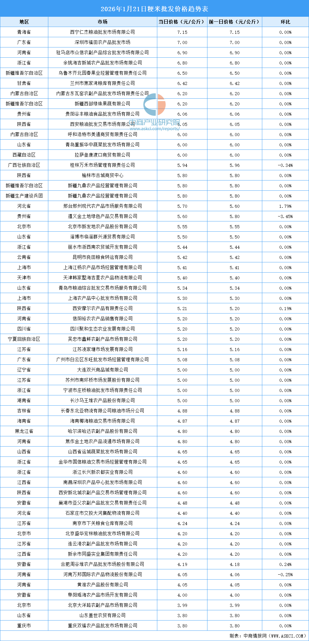 中商情报网讯:最新数据显示:1月21日,全国粳米当日均价为5.23元/公斤,籼米当日均价4.83元/公斤。其中,粳米价格最高的西宁仁杰粮油批发市场有限公司,当日价格为7.15元/公斤,环比持平。籼米价格最高的市场是拉萨叁康渡口商贸有限公司,当日价格为8.00元/公斤,环比持平。以下是2026年1月21日全国大米价格趋势表详情: