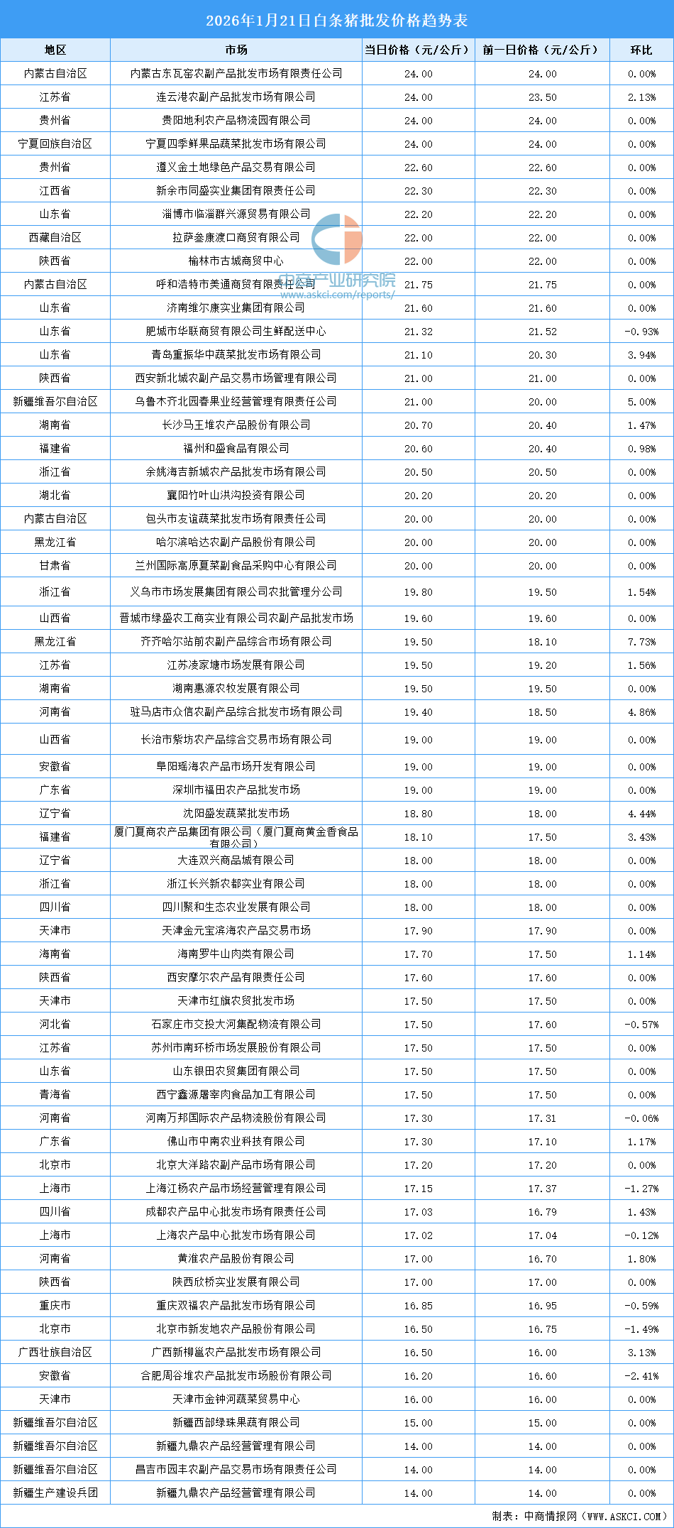 中商情报网讯:最新数据显示:1月21日全国白条猪平均价格为19.00元/公斤。其中,白条猪价格最高的市场是内蒙古东瓦窑农副产品批发市场有限责任公司、连云港农副产品批发市场有限公司、贵阳地利农产品物流园有限公司、宁夏四季鲜果品蔬菜批发市场有限公司,当日价格均为24.00元/公斤。白条猪价格最低的是昌吉市园丰农副产品交易市场有限责任公司和新疆九鼎农产品经营管理有限公司,当日价格均为14.00元/公斤。