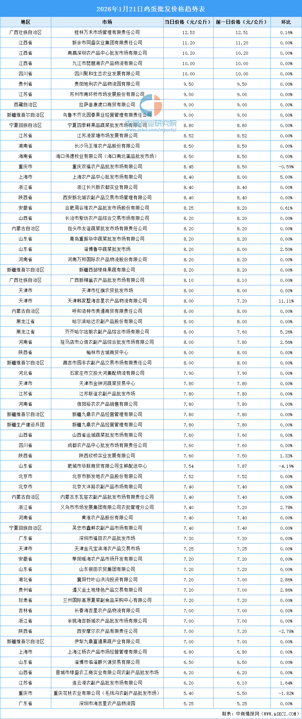 中商情报网讯:最新数据显示:1月21日全国鸡蛋平均价格为7.95元/公斤。其中,鸡蛋价格最高的市场是桂林万禾市场管理有限责任公司,当日价格为12.53元/公斤,环比上涨0.16%。鸡蛋价格最低的市场是深圳市海吉星农产品物流园,当日价格为5.25元/公斤,环比持平。
