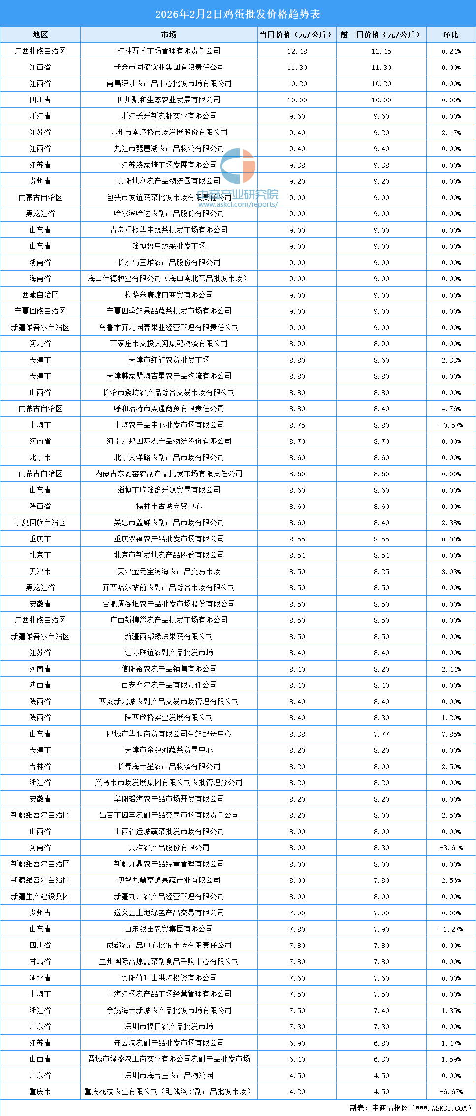 中商情报网讯:最新数据显示:2月2日全国鸡蛋平均价格为8.47元/公斤。其中,鸡蛋价格最高的市场是桂林万禾市场管理有限责任公司,当日价格为12.48元/公斤,环比上涨0.24%。鸡蛋价格最低的市场是重庆花枝农业有限公司(毛线沟农副产品批发市场),当日价格为4.20元/公斤,环比下跌6.67%。