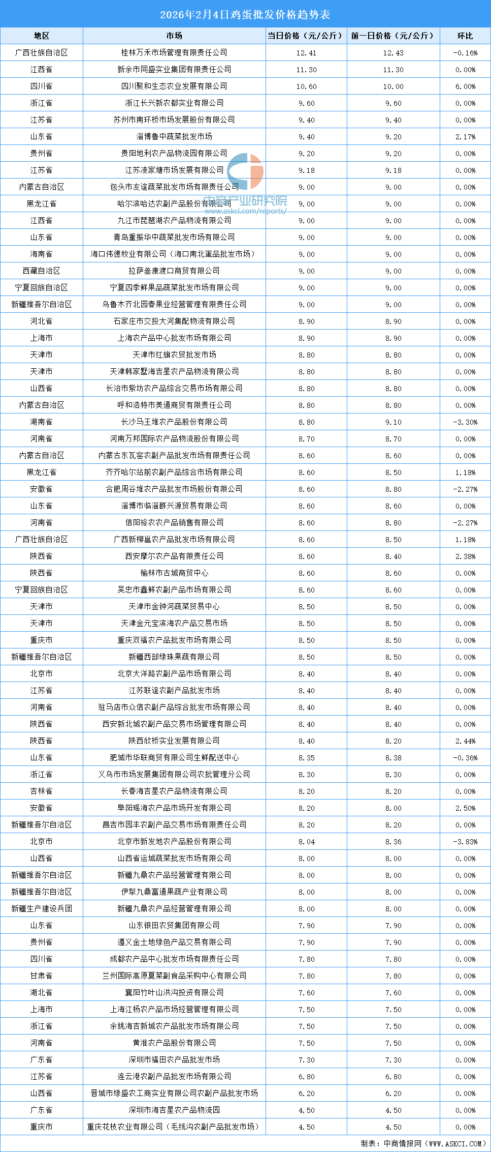 中商情报网讯:最新数据显示:2月4日全国鸡蛋平均价格为8.45元/公斤。其中,鸡蛋价格最高的市场是桂林万禾市场管理有限责任公司,当日价格为12.41元/公斤,环比下跌0.16%。鸡蛋价格最低的市场是深圳市海吉星农产品物流园和重庆花枝农业有限公司(毛线沟农副产品批发市场),当日价格均为4.50元/公斤。