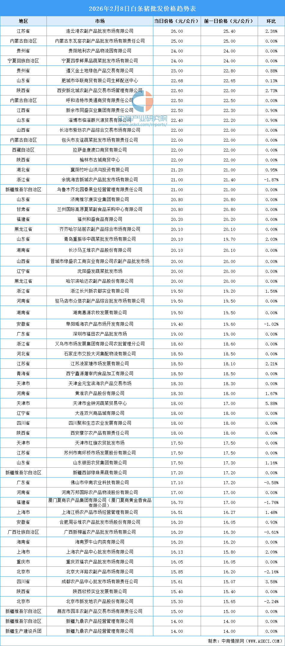 中商情报网讯:最新数据显示:2月8日全国白条猪平均价格为19.19元/公斤。其中,白条猪价格最高的市场是连云港农副产品批发市场有限公司,当日价格为26.00元/公斤,环比上涨2.36%。白条猪价格最低的是新疆九鼎农产品经营管理有限公司,当日价格为14.00元/公斤,环比持平。