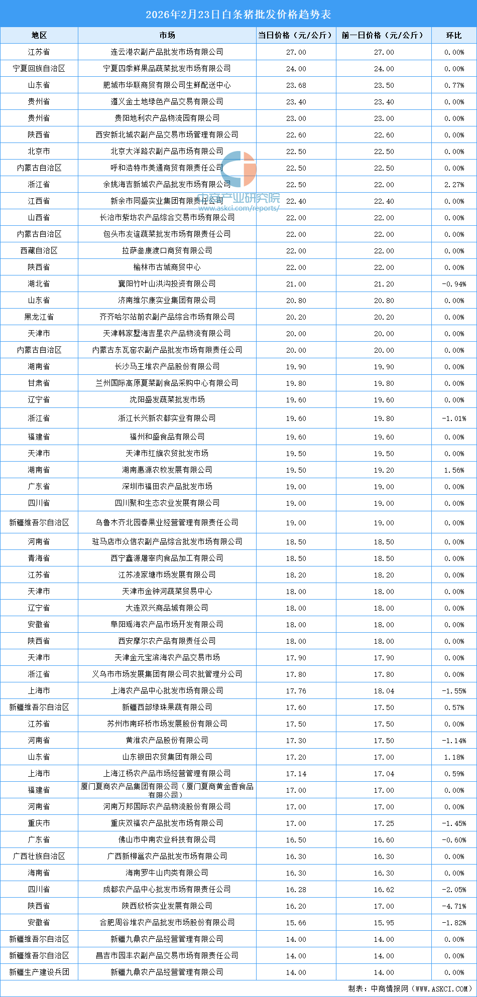 中商情报网讯:最新数据显示:2月23日全国白条猪平均价格为19.21元/公斤。其中,白条猪价格最高的市场是连云港农副产品批发市场有限公司,当日价格为27.00元/公斤,环比持平。白条猪价格最低的是昌吉市园丰农副产品交易市场有限责任公司、新疆九鼎农产品经营管理有限公司,当日价格均为14.00元/公斤,环比持平。