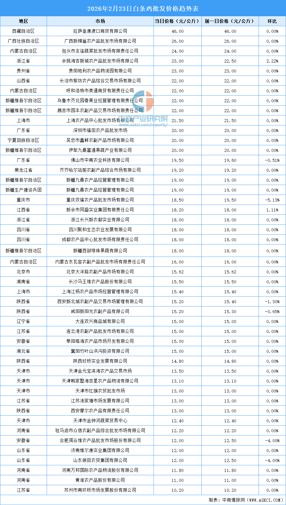 中商情报网讯:最新数据显示:2月23日全国白条鸡平均价格为17.53元/公斤。其中,白条鸡价格最高的市场是拉萨叁康渡口商贸有限公司,当日价格为46.00元/公斤,环比持平。白条鸡价格最低的市场是苏州市南环桥市场发展股份有限公司,当日价格为10.20元/公斤,环比持平。