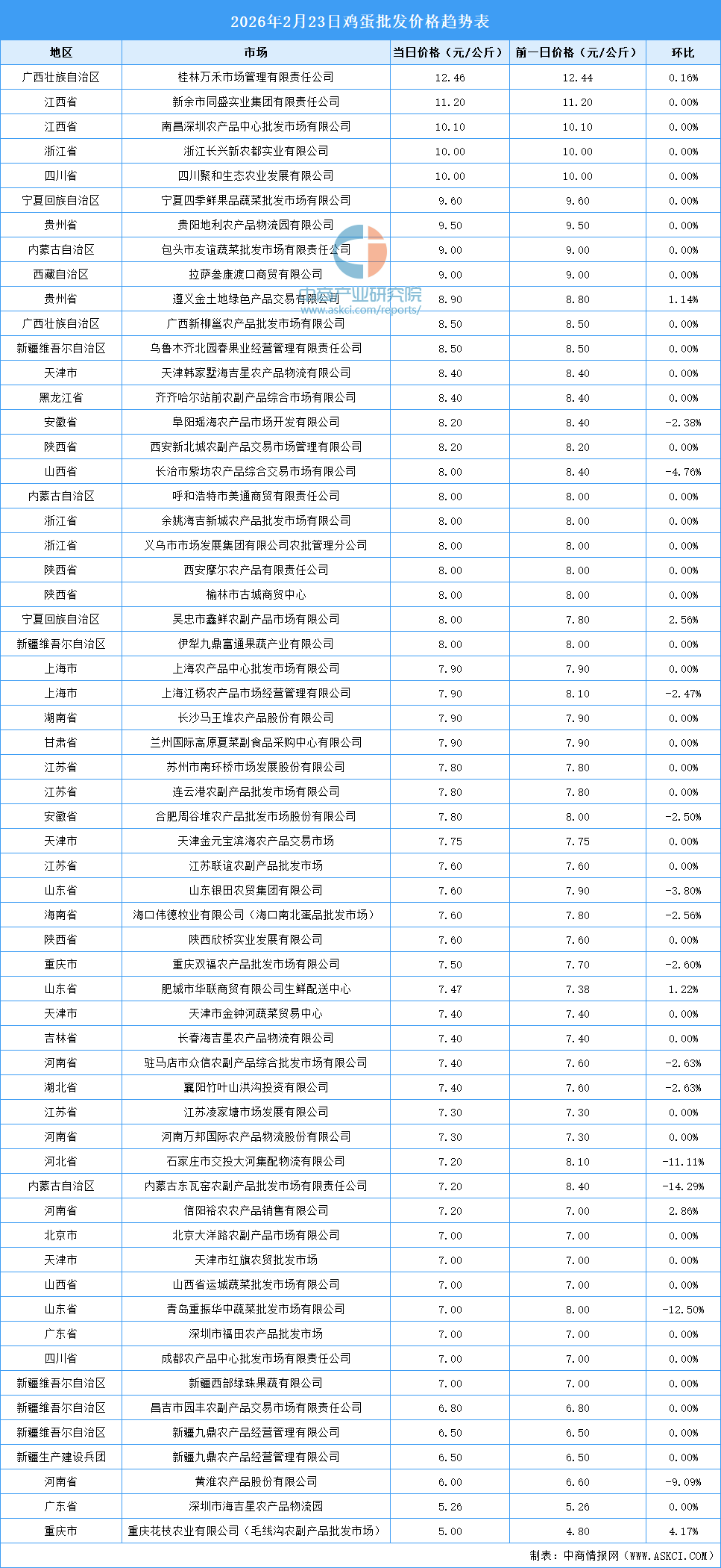 中商情报网讯:最新数据显示:2月23日全国鸡蛋平均价格为7.88元/公斤。其中,鸡蛋价格最高的市场是桂林万禾市场管理有限责任公司,当日价格为12.46元/公斤,环比上涨0.16%。鸡蛋价格最低的市场是重庆花枝农业有限公司(毛线沟农副产品批发市场),当日价格为5.00元/公斤,环比上涨4.17%。
