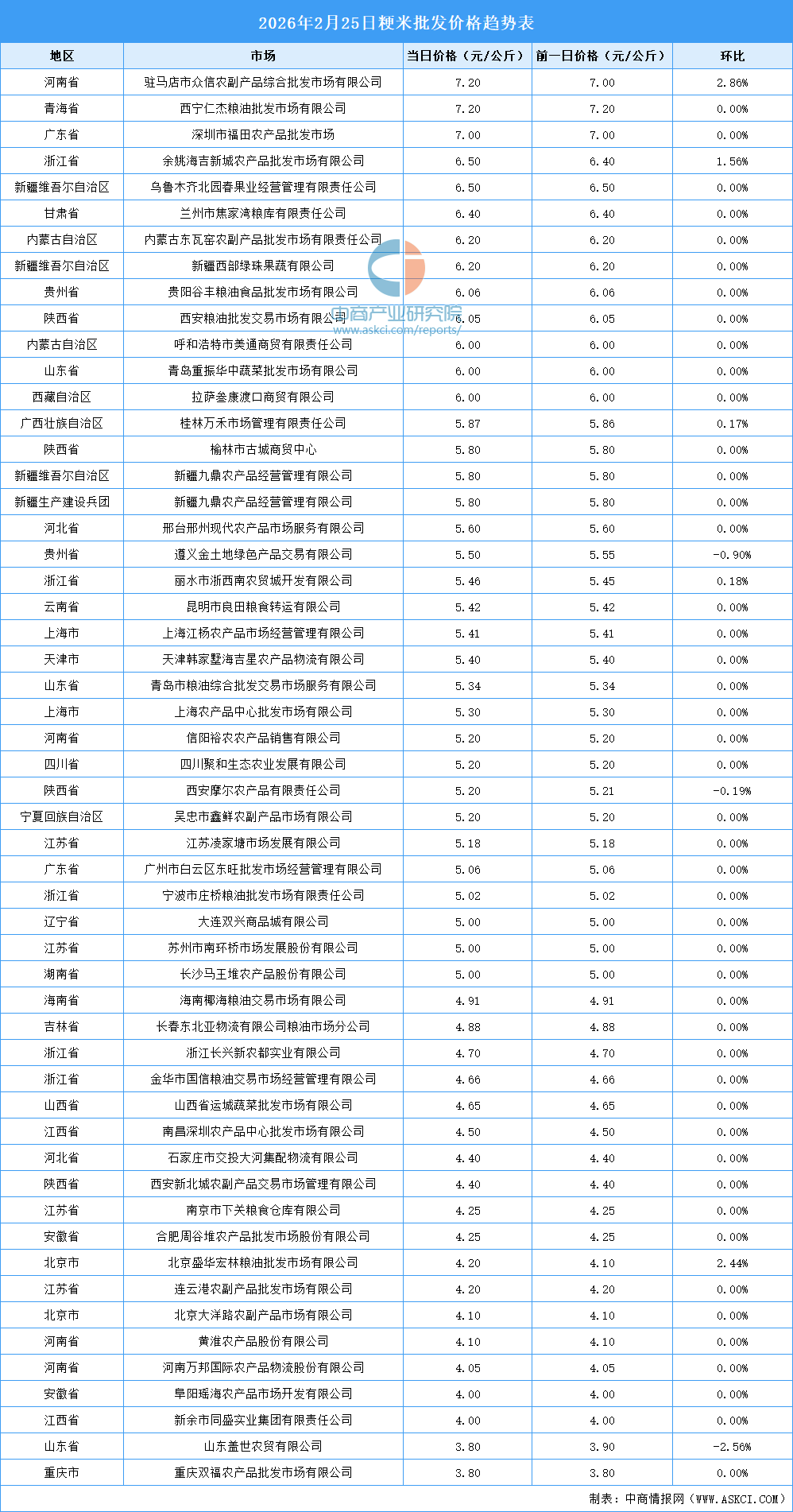 中商情报网讯:最新数据显示:2月25日,全国粳米当日均价为5.24元/公斤,籼米当日均价4.78元/公斤。其中,粳米价格最高的驻马店市众信农副产品综合批发市场有限公司、西宁仁杰粮油批发市场有限公司,当日价格均为7.20元/公斤。籼米价格最高的市场是拉萨叁康渡口商贸有限公司,当日价格为8.00元/公斤,环比持平。以下是2026年2月25日全国大米价格趋势表详情: