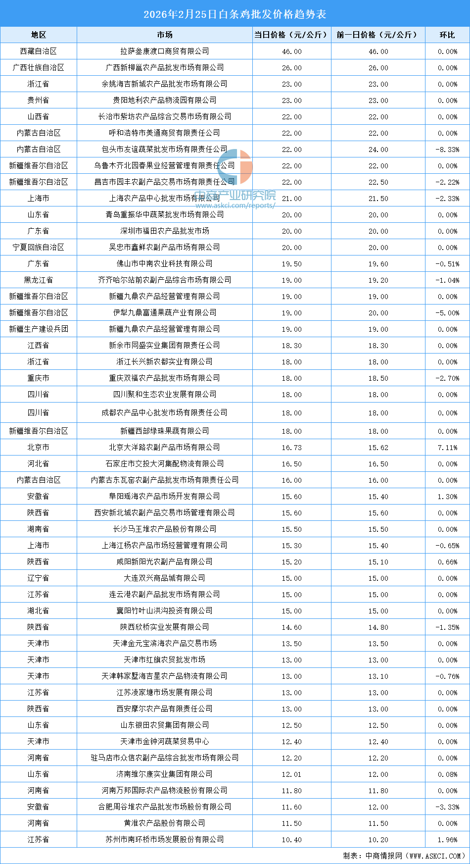 中商情报网讯:最新数据显示:2月25日全国白条鸡平均价格为17.53元/公斤。其中,白条鸡价格最高的市场是拉萨叁康渡口商贸有限公司,当日价格为46.00元/公斤,环比持平。白条鸡价格最低的市场是苏州市南环桥市场发展股份有限公司,当日价格为10.40元/公斤,环比上涨1.96%。